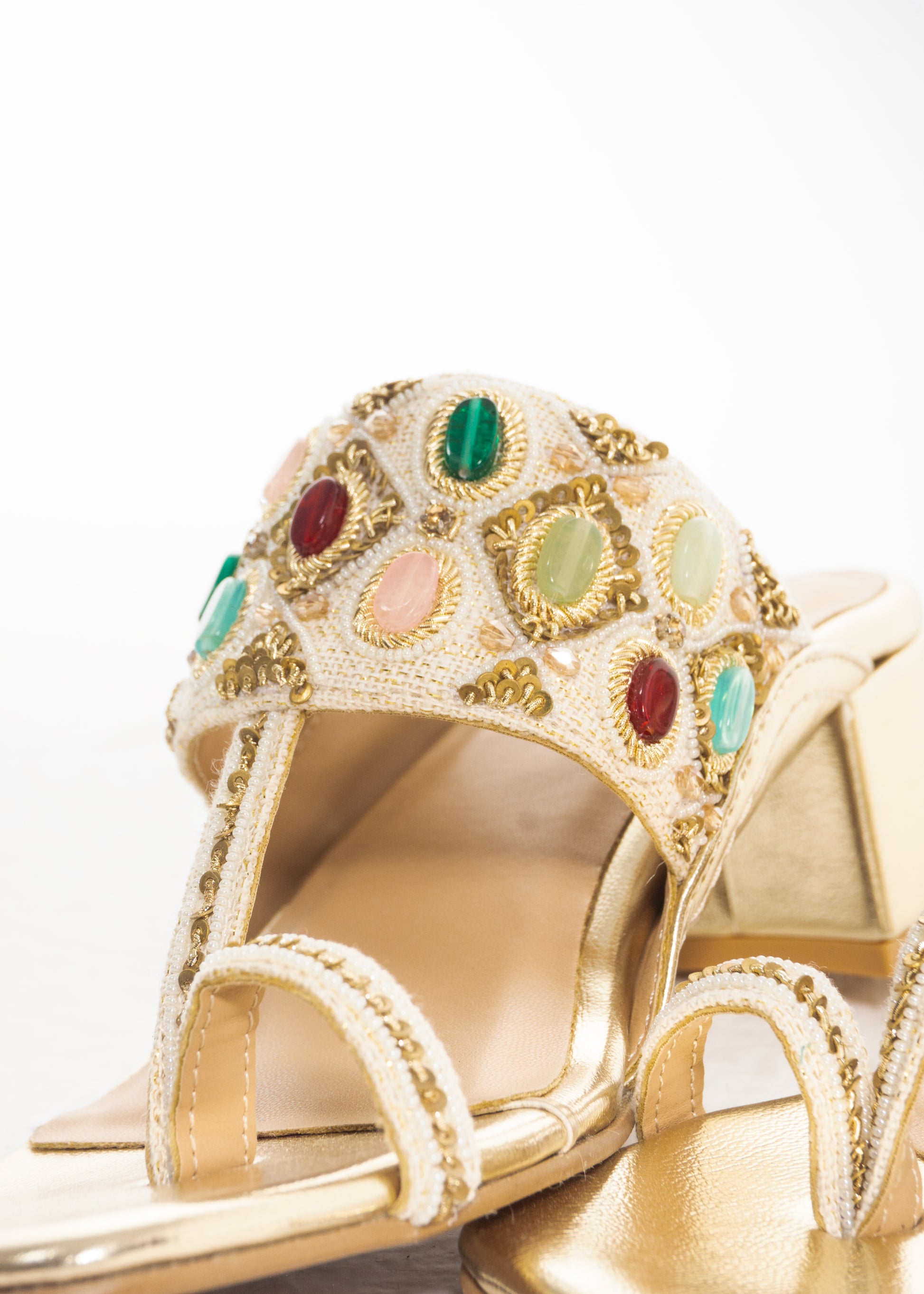 Description: Vegan Hand-Embroidered Block Heel Sandals, Crafted in a soft metallic finish, these 2.25-inch vegan block heels feature intricate hand embroidery with multicolour stone accents. Designed with a cushioned footbed and a stable block heel for effortless elegance and all-day comfort—perfect for festive and occasion wear.