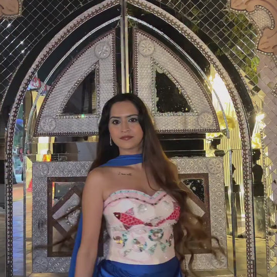 Description: Designed with a modern corset silhouette, this garment is crafted from premium satin lycra and fluid net or the corset. It features an artistic "Aquatic Life" theme, showcasing intricate hand embroidered motifs of marine life and koi scales.