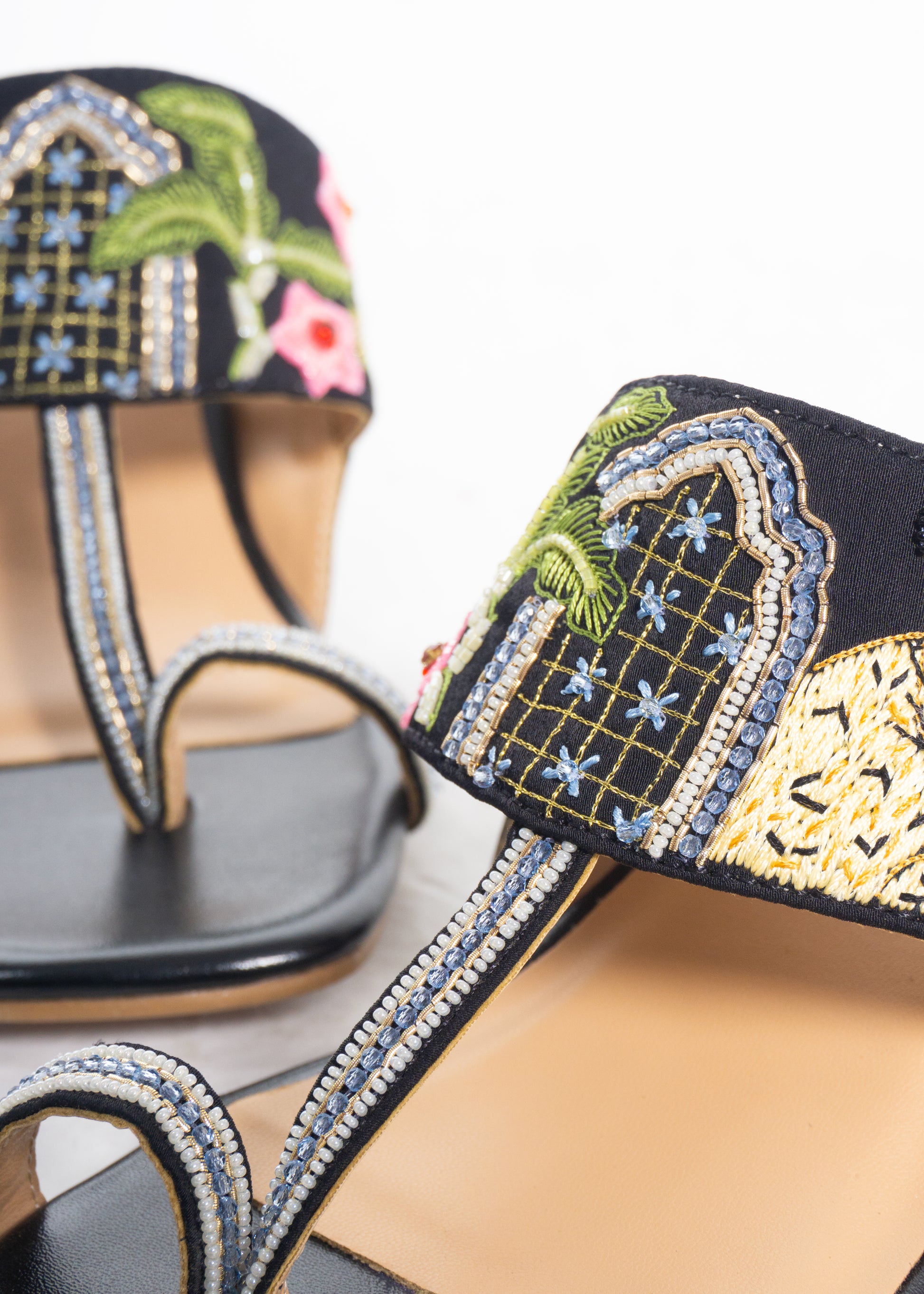 Description: Hand-Embroidered T-Strap Heels, Designed for effortless elegance, these vegan 2.25-inch T-strap heels feature a beautifully hand-embroidered upper with intricate floral and architectural motifs inspired by traditional craftsmanship. The structured T-strap silhouette and cushioned insole ensure comfort and stability—perfect for festive daytime wear and refined evening outings.
