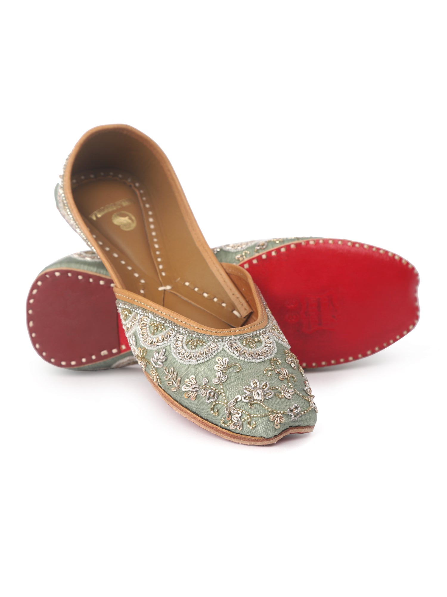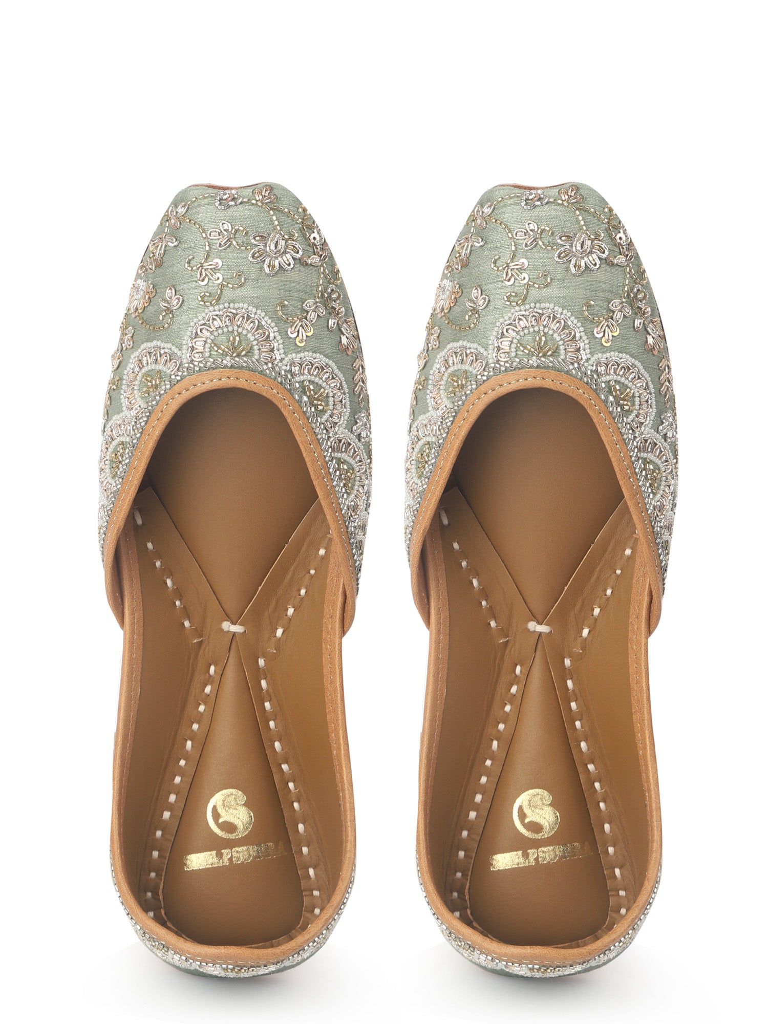 A perfect fusion of earthy elegance and metallic grace, the Olive Dust Jutti is crafted on a refined olive-gray base, making it both timeless and unique. The jutti features exquisite hand embroidery in golden and silver tones, delicately worked to create a luxurious yet subtle shimmer.