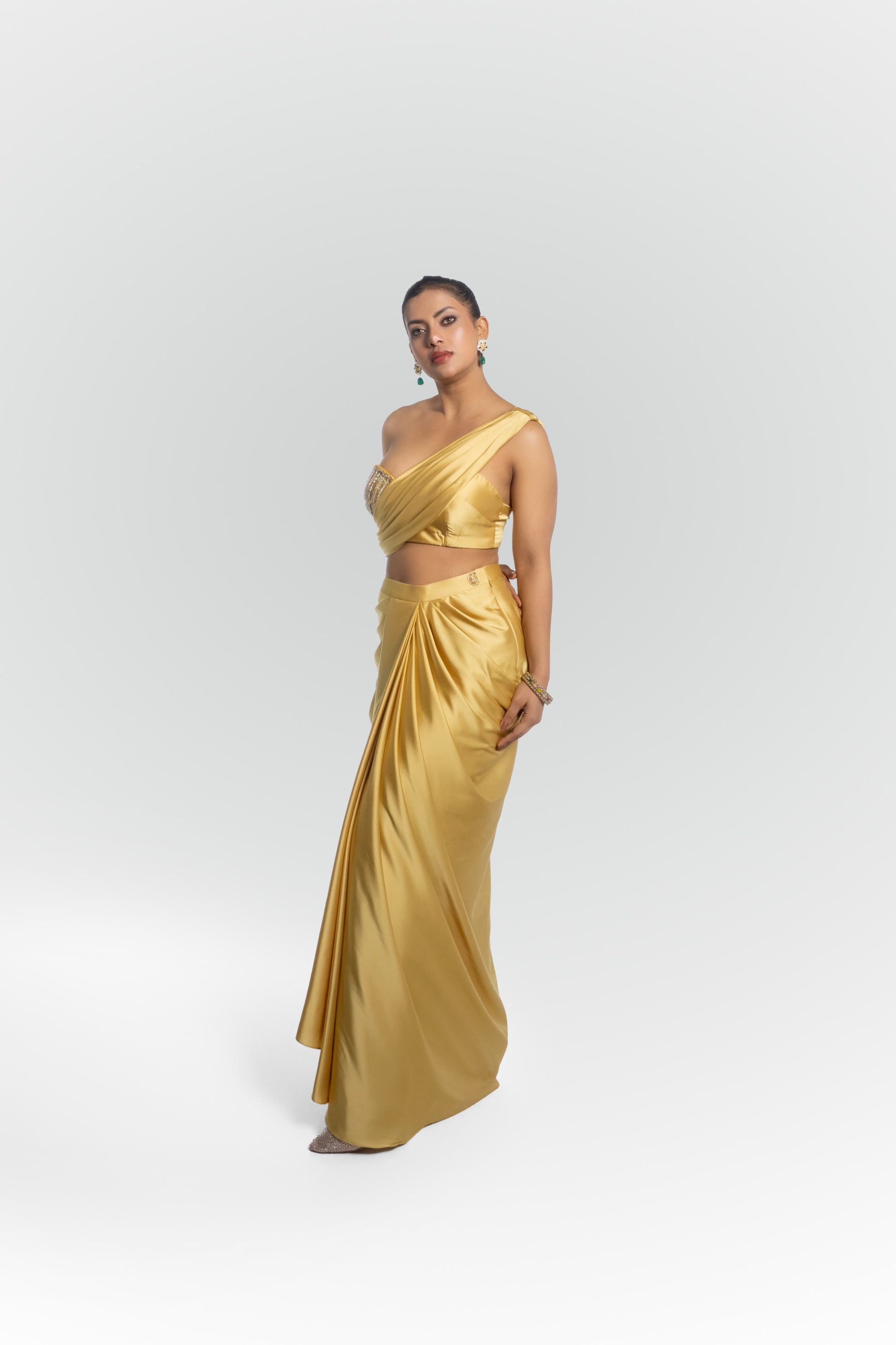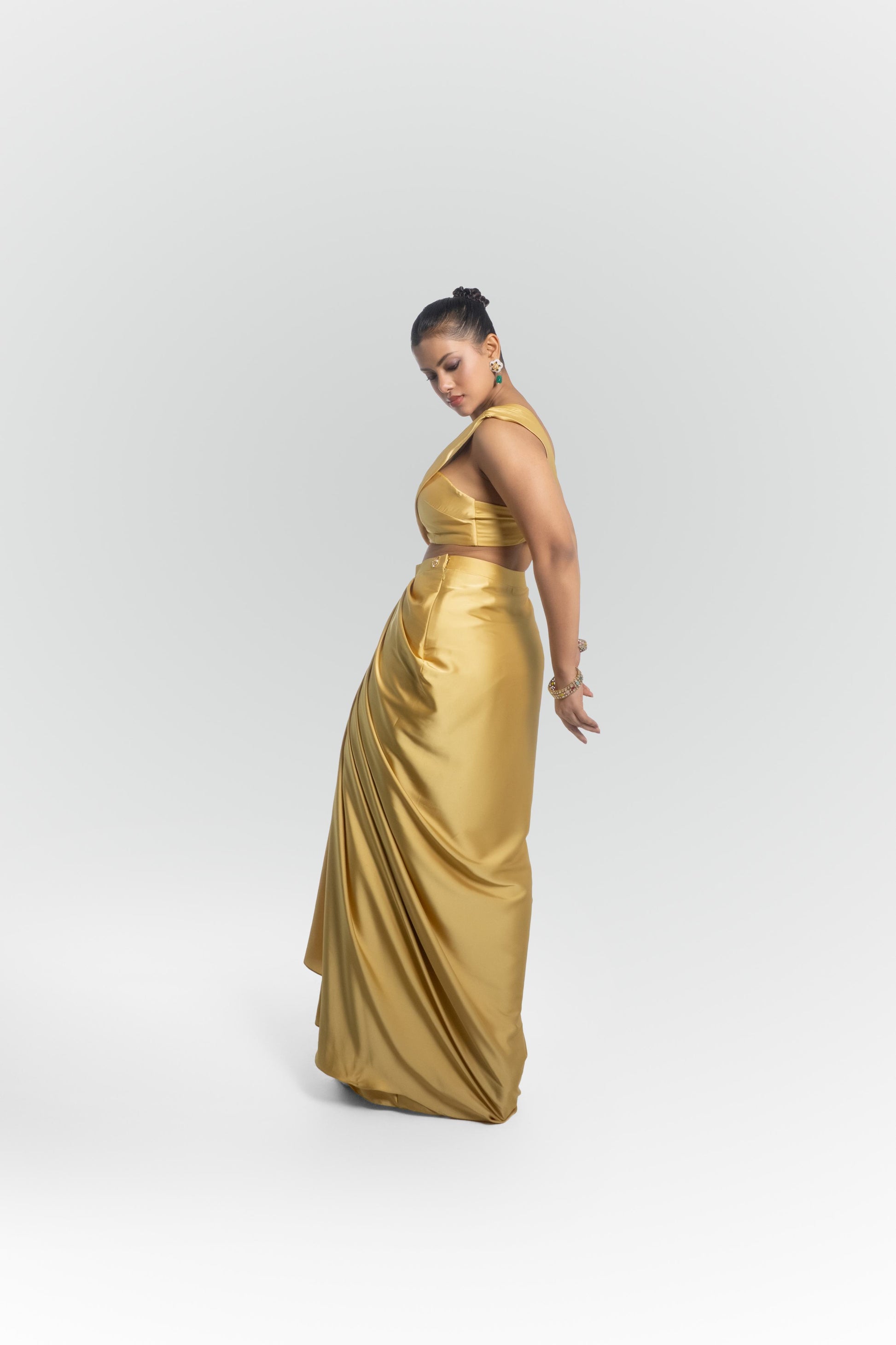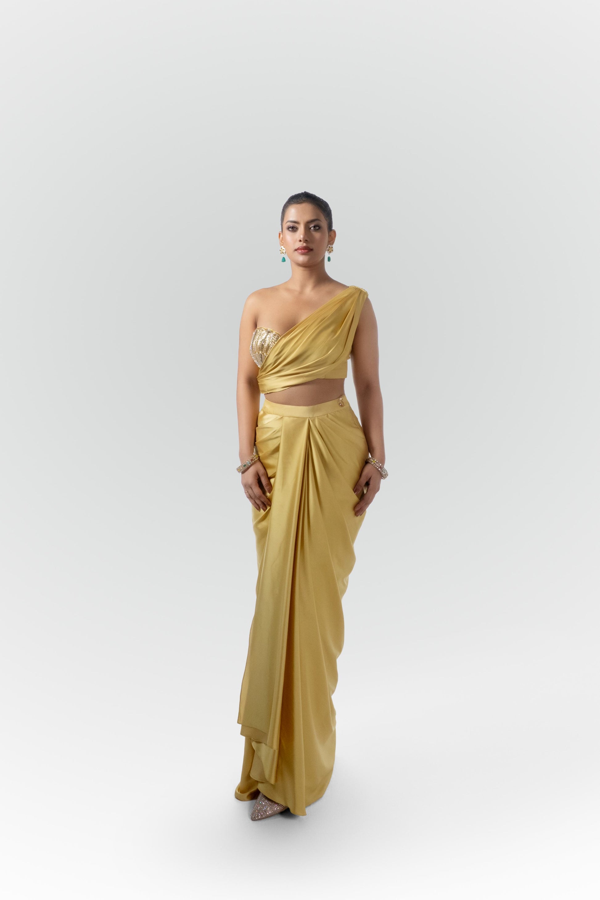 Type of Dress:metallic gold sculptural draped skirt embroidered blouse set
