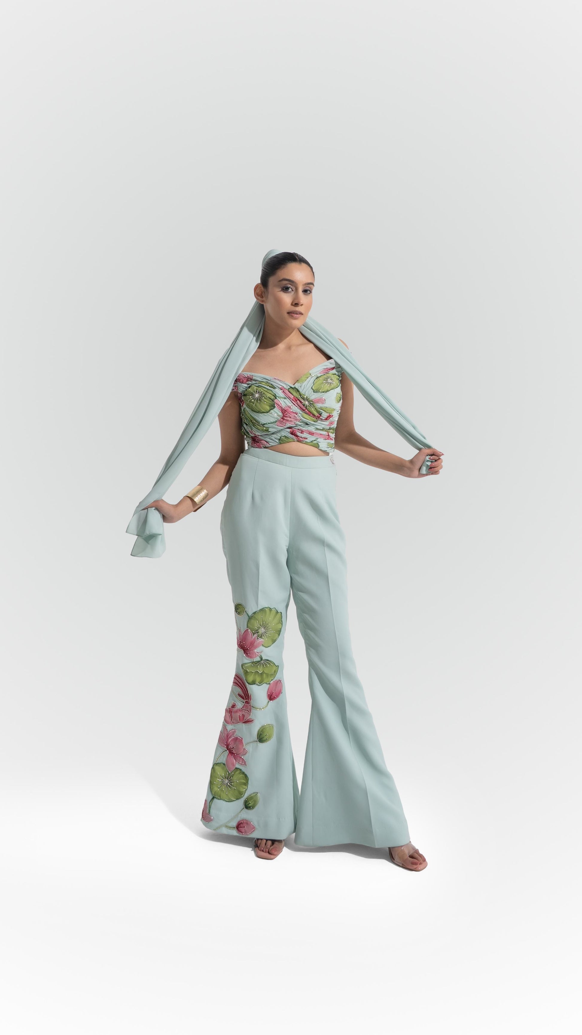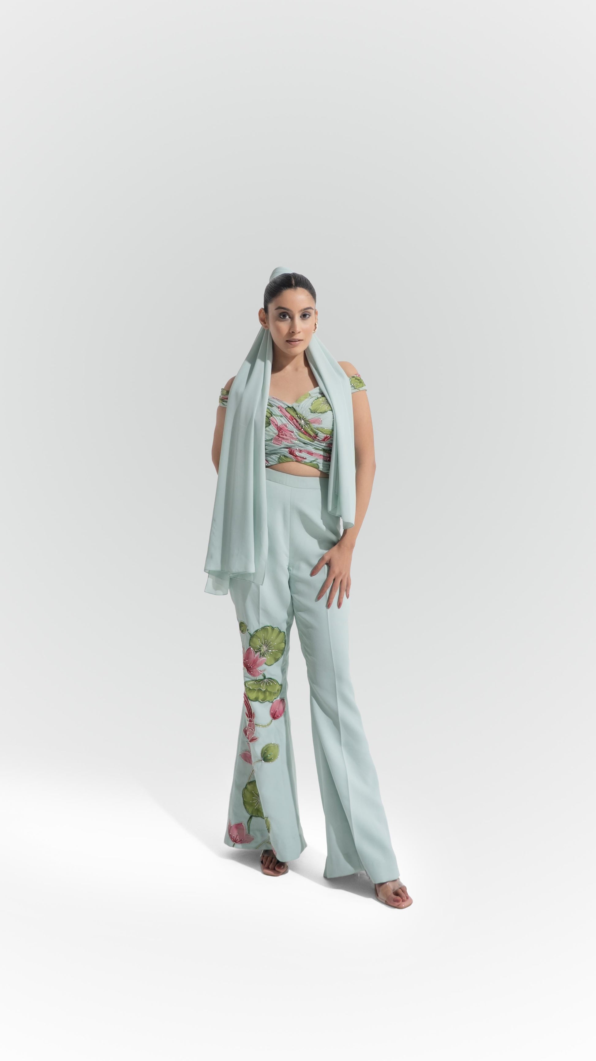 Description: Designed with a modern off-shoulder silhouette, this set is crafted from a luxurious of royal georgette. The garment explores a "Lotus Pond" theme, showcasing artisan hand-painting of vibrant pink lilies and green foliage and koi fish that flows down the leg of the trousers. The look is refined with delicate embroidery and sequin highlights on the bodice, finished with a flowy detail in the back that serves as an elegant, integrated scarf drape