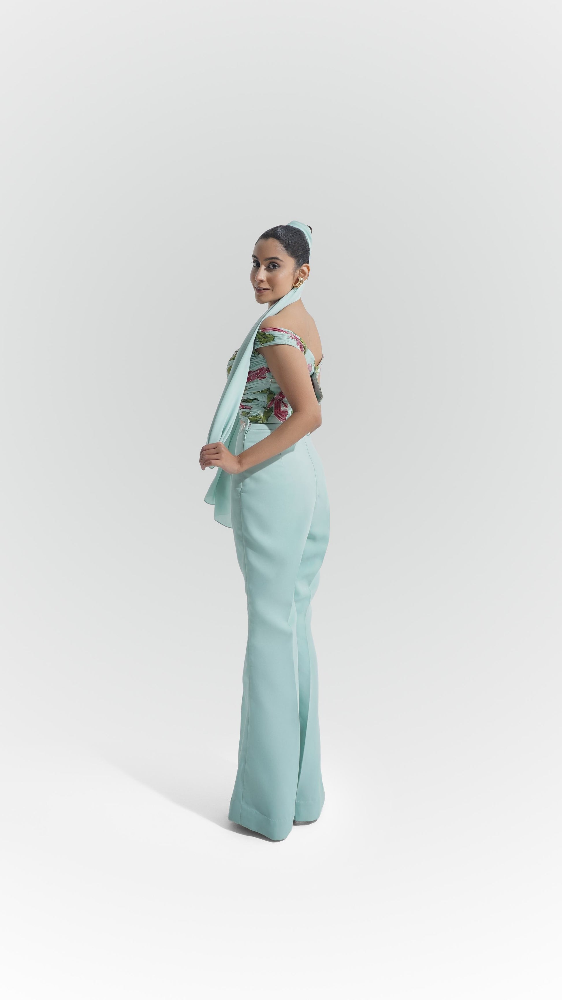 Type of Dress: draped crop top and tailored flared trousers